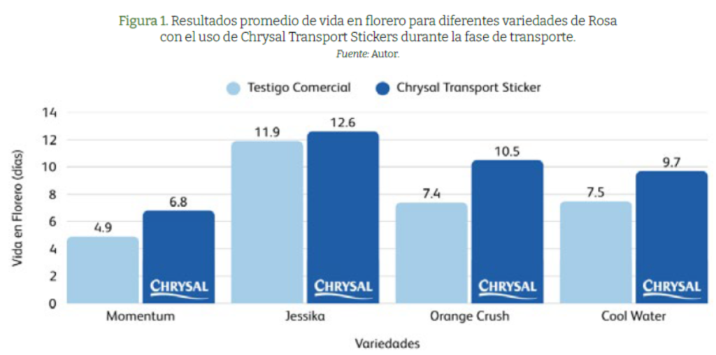 En evaluaciones realizadas con variedades como ‘Momentum’, ‘Jessika’ ‘Orange Crush’ o ‘Cool Water’ el uso del Chrysal Transport Stickers ha permitido aumentar la vida en florero en 2-3 días en promedio (Figura 1). Estos resultados positivos se han obtenido de forma generalizada en variedades que son en mayor o menor medida propensas a problemas de calidad, aumentando su vida en florero.