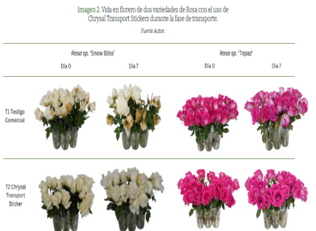 Chrysal ha evaluado Chrysal Transport Stickers en diferentes especies y variedades de flor, obteniendo de forma consistente resultados positivos que soportan su oferta de valor. A modo de ejemplo se presentan a continuación los resultados visuales de vida en florero para las variedades de rosa ‘Snow Bliss’ y ‘Topaz’ posterior a la aplicación de Chrysal Transport Stickers durante la fase de transporte (Imagen 2). Desde el día 0 de inicio de la vida en florero ya se aprecian diferencias visuales claras respecto al tratamiento comercial en parámetros como incidencia de enfermedades y calidad de la flor. A los 7 días de vida en florero se observa una mayor duración de las flores, con menor número de flores con cabeceo o senescencia, mejor apertura y mejor color con el uso de Chrysal Transport Stickers.