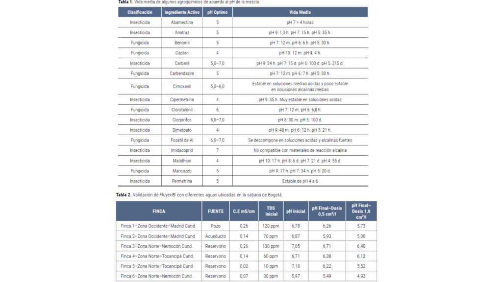 Un ejemplo es el fungicida Mancozeb, que pierde rápidamente su eficacia en soluciones muy ácidas. Esto subraya la importancia de ajustar el pH del agua al rango recomendado por los fabricantes de agroquímicos, generalmente entre 5.5 y 6.5, para maximizar su desempeño y prolongar la vida útil del producto (Schilder 2008).